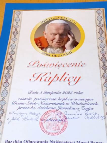 Uroczystość poświęcenia kaplicy na zawsze pozostanie w pamięci Sióstr jako dzień łaski, modlitwy i szczególnej bliskości Boga. Niech ta święta przestrzeń stanie się źródłem pokoju, miejscem spotkania z Chrystusem oraz duchowym domem dla wszystkich, którzy będą tu szukać światła i nadziei.